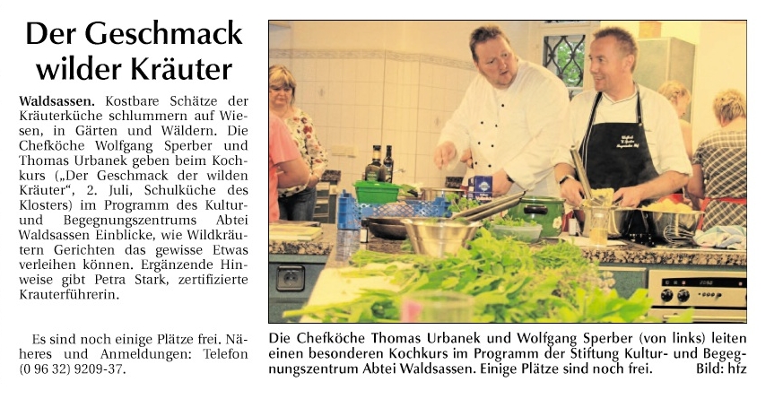 Kochkurs: Der Geschmack der wilden Kräuter Leckerbissen aus der Natur frisch aufgetischt Früher wurden manche Kräuter und Gewürze mit Gold aufgewogen und auch heute schlummern noch viele kostbare Schätze der Kräuterküche auf Wiesen, in Gärten und Wäldern. Unsere zwei Chefköche geben zahlreiche Hinweise zu Wildkräutern, die den Gerichten das gewisse Etwas verleihen. Gleichzeitig können Sie sich selbst überzeugen, wie lecker die gefundenen Schätze schmecken! Sie kochen ein leckeres Menü in geselliger Runde an diesem Abend mit zwei Chefköchen von Restaurants aus Waldsassen. Die Referenten werden den Teilnehmern auch Wissenswertes über die Verwendung von Kräutern in der Küche vermitteln. Dabei wird ein 3-Gang Menümit frischen Wildkräutern durch die Teilnehmer zusammen mit den Referenten gekocht und anschließend gemeinsam verzehrt. Mit dabei ist die zertifizierte Kräuterführerin Petra Stark. Von Frau Stark lernen Sie Wildkräuter an ihren Standorten zu finden und zu bestimmen. Außerdem wird auch eine leckere Wildkräuter-Limonade zusammen hergestellt. Ganz nebenbei gibt es noch Tipps zur Herstellung von Brotaufstrichen, Kräutersalz oder Wildkräuteressig. Mitzubringen:Kochschürze, Geschirrtuch, Schreibunterlagen, Appetit max. 16 Teilnehmer Leitung: Wolfgang Sperber, Bayerischer Hof Waldsassen und Thomas Urbanek, Prinzregent Luitpold Waldsassen Anmeldeschluss: 23.06.2014 unter Tel.: 09632/9200-37 Fax 09632/9200-47