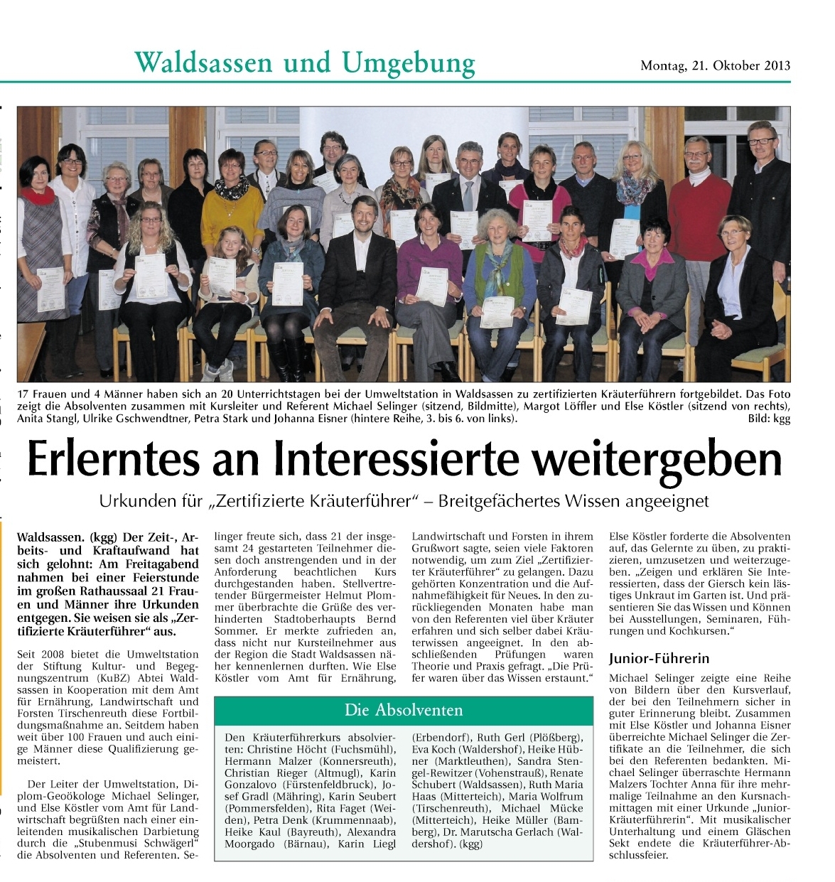 Der neue Tag Bericht Zeugnisübergabe zertifizierte Kräuterführer 2013 Umweltstation Waldsassen