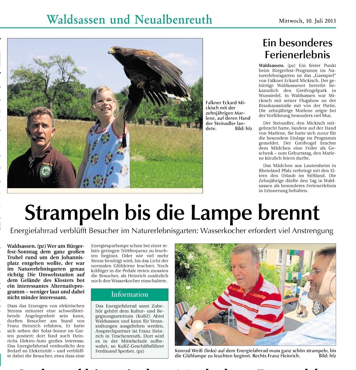 Greifvögel sind immer wieder faszinierend. Auch in diesem Jahr gibt Eckard Mickisch vom Greifvogelpark Falknerei Katharinenberg eine Vorstellung mit seinen Falken. Außerdem besteht die Möglichkeit, ein Energiefahrrad im Naturerlebnisgarten zu testen und dabei mit eigener Muskelkraft Energie zu erzeugen. Das 1. Akkordeonorchester Waldsassen e. V. sorgt erneut für die musikalische Unterhaltung.